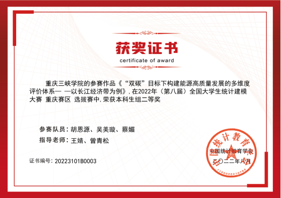 自3月下旬启动以来,历时5个月,全国共有5760支参赛队层层角逐,依次经历校赛、省赛和国赛,我院王婧老师、曾青松老师指导胡恩源、吴美璇、蔡媚三位同学的参赛作品《“双碳”目标下构建能源高质量发展的多维度评价体系—以长江经济带为例》斩获重庆赛区本科组二等奖,实现了我院在统计建模类比赛奖项零的突破。