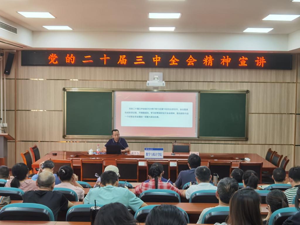 在宣讲过程中,郭作飞紧密联系学校实际,全面、准确地解读了党的二十届三中全会召开的重大意义、全会《决定》提出的进一步全面深化改革的重大举措。他着重强调,教育领域的改革是全面深化改革的重要组成部分,对二级学院的发展具有极其重要的意义。数统学院和继续教育学院要深刻学习领会会议精神,认真贯彻落实全会作出的重大战略部署,持续推进教育教学改革,不断提高人才培养质量,为国家培育更多高素质的创新型人才。郭作飞鼓励全体教职工要将党的二十届三中全会精神转化为实际行动,在工作中勤奋努力、不懈奋斗,积极为学校的发展贡献自己的力量。他的精彩宣讲赢得了现场教师的阵阵热烈掌声,参会教师纷纷表示,通过此次宣讲,对党的二十届三中全会精神有了更为深刻的理解和认识,将以更加饱满的热情和昂扬的斗志投入到学习和工作中去。