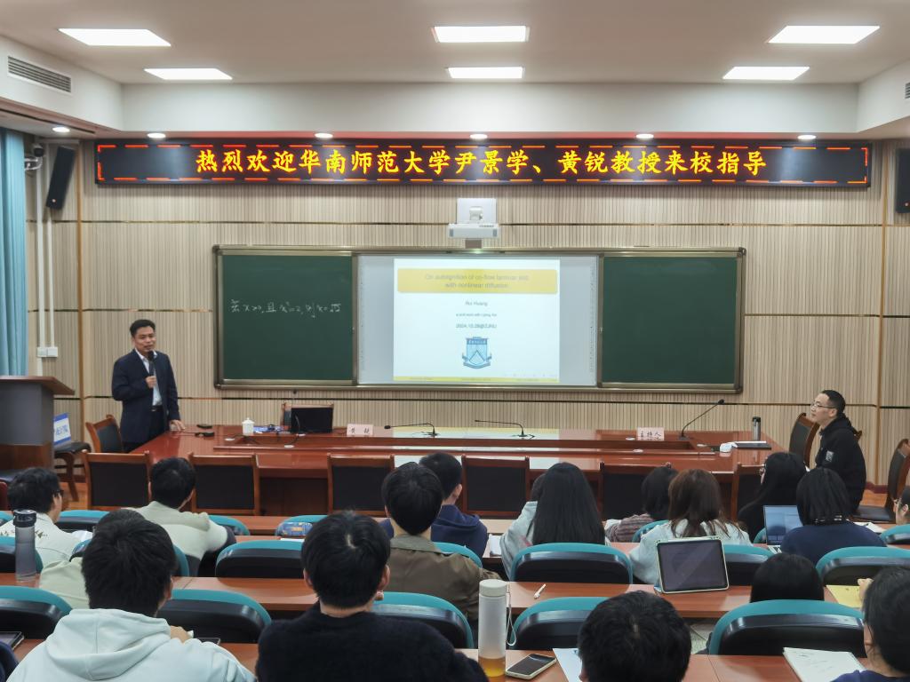 为进一步加强在非线性扩散方程研究领域的合作,继续深化对具非线性扩散问题的研究,2024年11月2日,华南师范大学长江学者特聘教授、国家杰出青年基金获得者、国家级教学名师尹景学教授,“广东特支计划”科技创新青年拔尖人才、重庆市“巴渝学者”讲座教授黄锐教授应邀来学院做学术讲座。学院教师、研究生等参加会议。