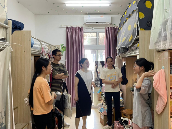 走访时,黄书记与考研留校学生亲切交谈,叮嘱同学们暑假在校注意防暑,备好生活用品,合理规划学习时间,认真备考,向自己的目标积极奋进,如有困难及时寻求帮助。走访过程中,辅导员老师们排查了安全隐患,提醒同学们注意用电安全,严禁使用大功率电器,注意防火防盗防溺水防诈骗,合理安排饮食,积极锻炼身体。