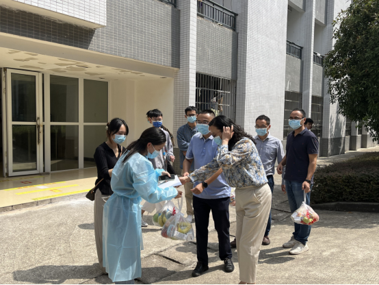 为了切实关心关爱集中健康观测的学生,9月4日上午,44118太阳成tyc城集团党总支书记黄明靖、院长熊江、副院长赵永祥、党总支副书记兼副院长涂正文带领全体辅导员来到学生宿舍,委托健康观测区志愿者老师为集中健康观测同学送去水果、牛奶、糕点等慰问品,表达学院对他们的问候。