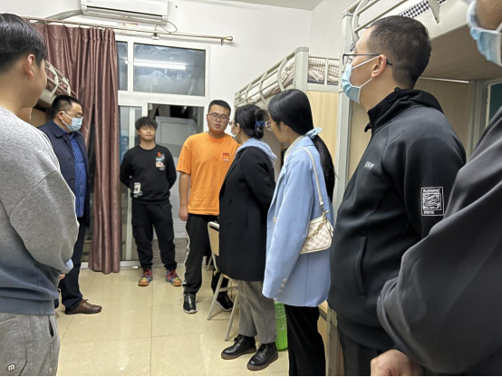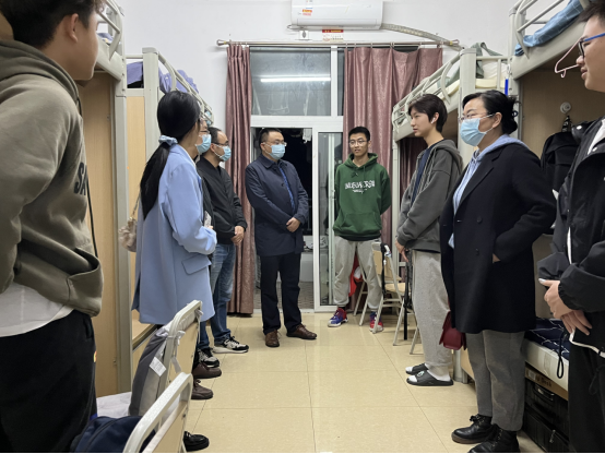 2022年11月4日晚,44118太阳成tyc城集团党总支书记黄明靖、院长熊江、副院长赵永祥、副院长涂正文一行带领学工人员走访新生宿舍,看望2022级新同学。