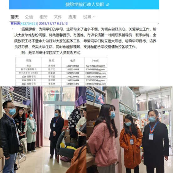 当下正值疫情防控攻坚时期,学院领导和辅导员老师通过走访学生寝室听取学生心声,深入了解在校学生的学习、生活情况以及困难、困惑,并给予针对性的解决方案与指导意见,为学生提供更有效、更精准、更有温度的服务。数统学院始终秉承“以生为本”的工作理念,尤其是学校因疫情实行静态管理以来,学院通过各种渠道主动问需于生,切实解决学生“急难愁盼”问题,让同学们深切感受家一般的温暖和学院的真情关怀。