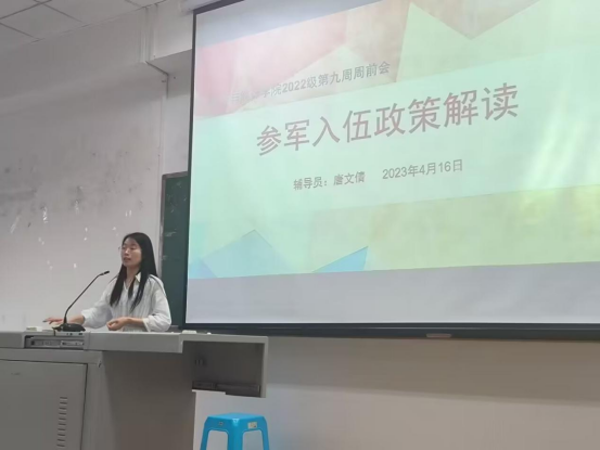 会上,各年级辅导员通过解读2023年征兵宣传手册,播放征兵公益宣传片《火热军营,精彩人生》,并结合大学生征兵时间、入伍基本条件、应征入伍程序、参军入伍优惠政策、毕业生应征优待政策等方面,向同学们介绍了高校学生参军的各项规定和要求,充分调动了同学们应征入伍的积极性。