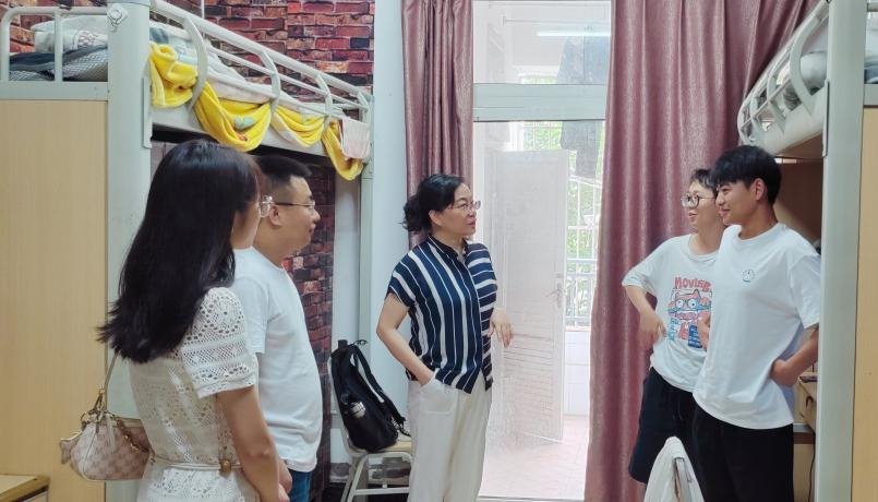 走访时,黄书记与考研留校学生亲切交谈,询问学生近期学习情况,叮嘱同学们合理规划目标,量力而行,积极备考,同时强调暑假在校注意防洪防暑,关注天气变化,备好生活用品,注意交通安全和寝室安全,生活上如有困难及时与老师联系。走访过程中,辅导员老师们提醒同学们注意用电安全,严禁使用大功率电器,注意防火防盗防溺水防诈骗,合理安排饮食,积极锻炼身体,按时归寝。