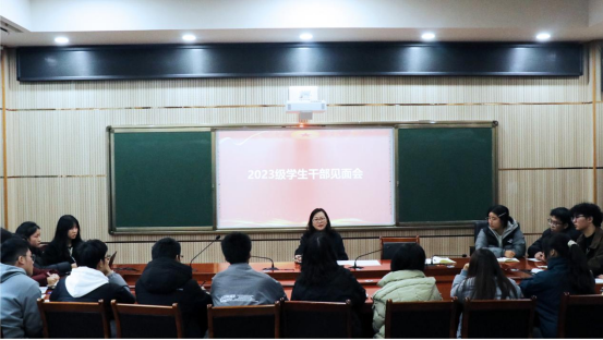 黄书记指出,学生干部在班级建设和学风建设中起着至关重要的作用,她希望学生干部增强责任意识,提升工作能力,完善规章制度,用好管理方法,做好示范引领,主动为同学服务,多做暖人心的事实好事,配合辅导员管理好班级;黄书记表示,学生干部在日常工作中遇到问题和困难要及时向辅导员汇报,也要学会向导师和分管领导寻求帮助。她希望学生干部要系统考虑,科学谋划,提升班级综合实力,尽早为评选先进班集体、十佳校园之星等荣誉做准备、打基础。
