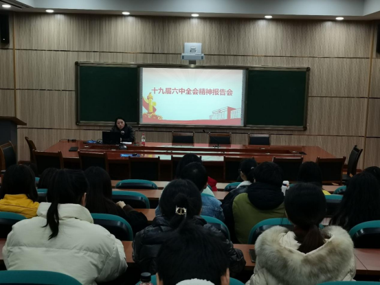 张婷婷为同学们介绍了十九届六中全会的基本概况,并向同学们传达了十九届六中全会精神。其中,张婷婷带领同学们集中学习了十九届六中全会中出现的一组数字,分别是三个“需要”、两个“确立”、十个“坚持”、五大“历史意义”、牢记一个“根本问题”、四个“必须”、一次“十分重要的代表大会”、一个“号召”。